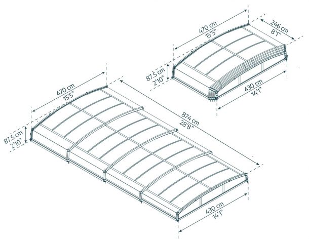 Pratęskite vasarą mėgaudamiesi maudynėmis šiltesniame vandenyje ir pasirūpinkite, kad Jūsų baseinas būtų švarus ir saugus visiems. Teleskopinis baseino stogelis su ratukais yra elegantiško dizaino, todėl puikiai įsilieja į Jūsų lauko erdvę. Baseino uždengimas pagamintas iš itin lanksčių ir lengvų medžiagų, sklandžiai ir lengvai slenka į abi puses, todėl prie baseino galėsite prieiti kaip tik norite. Jis specialiai suprojektuotas taip, kad galėtumėte maudytis po danga net ir atvėsus orams. Baseino danga pagaminta iš itin patvarių ir atsparių medžiagų, atlaikančių atšiaurias oro sąlygas. Smūgiams atsparios polikarbonato plokštės apsaugo Jus ir Jūsų baseiną nuo kenksmingų UV spindulių. Stogui naudojamas kanalinis polikarbonatas, šonams – monolitinis. Milteliniu būdu dengtas aliuminis sertifikuotas „Qualicoat® Qualimarine” lipduku.