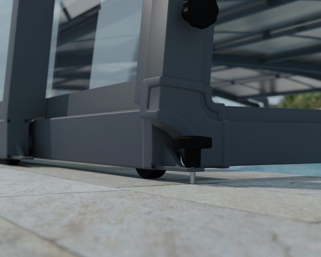 Dėl lengvos konstrukcijos su ratukais ir „Push ‘n Lock” sistemos baseino dangtį lengvai gali valdyti vienas žmogus. Atidaryti galima iš abiejų galų. Baseino stogelis pagamintas iš nerūdijančio plieno detalių ir nailoninių ratukų, užtikrinančių didelį patvarumą chloruotoje aplinkoje.