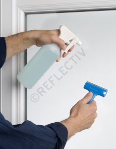 1. Naudodami lango valytuvą, gramdiklį ir vandens purkštuvą su muiluotu vandeniu, gerai išvalykite lango stiklą. Nuvalę, vėl užpurškite muiluotu vandeniu ir palikite.